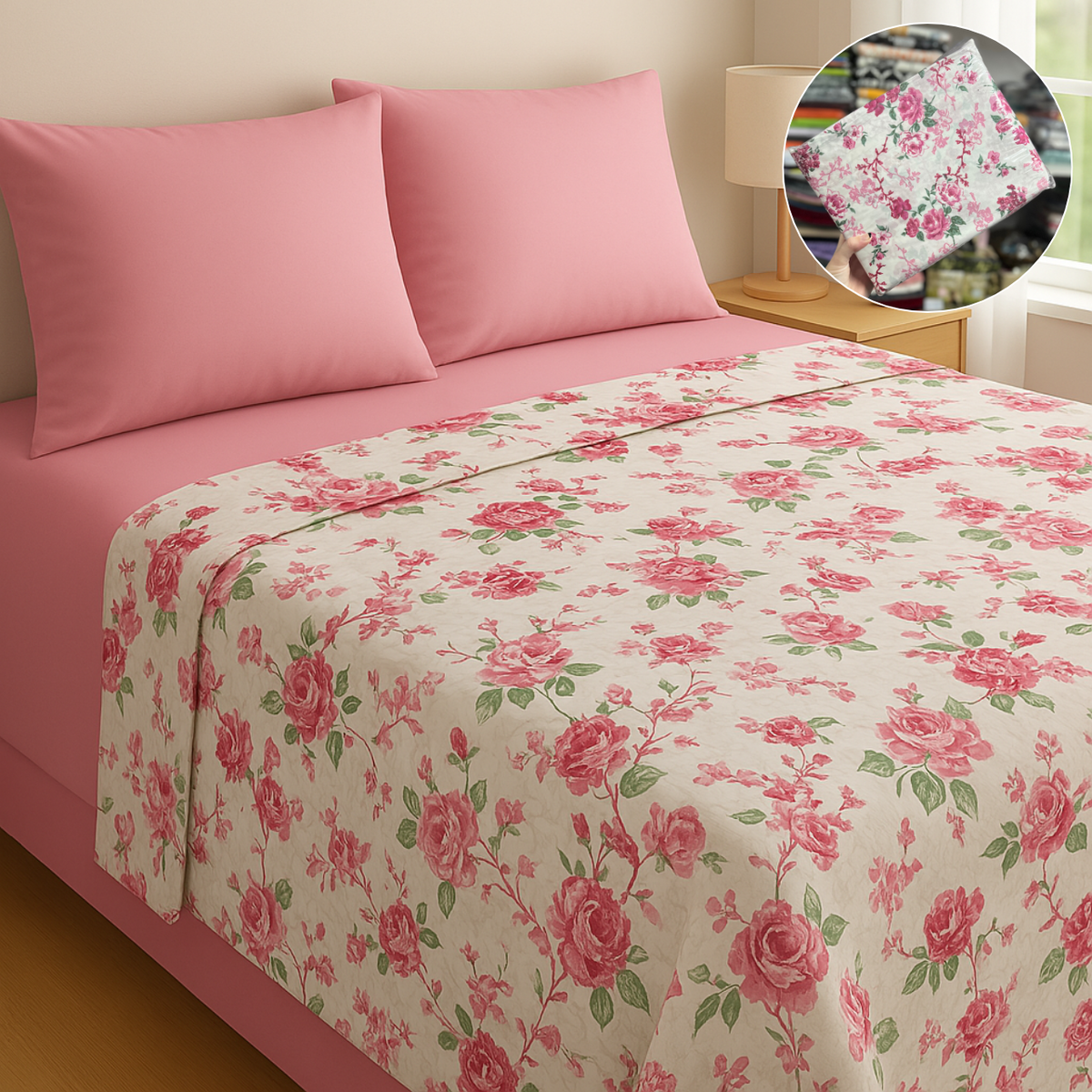 Sábana ajustable y fundas de almohada lisas, sólo la sábana superior es estampada.